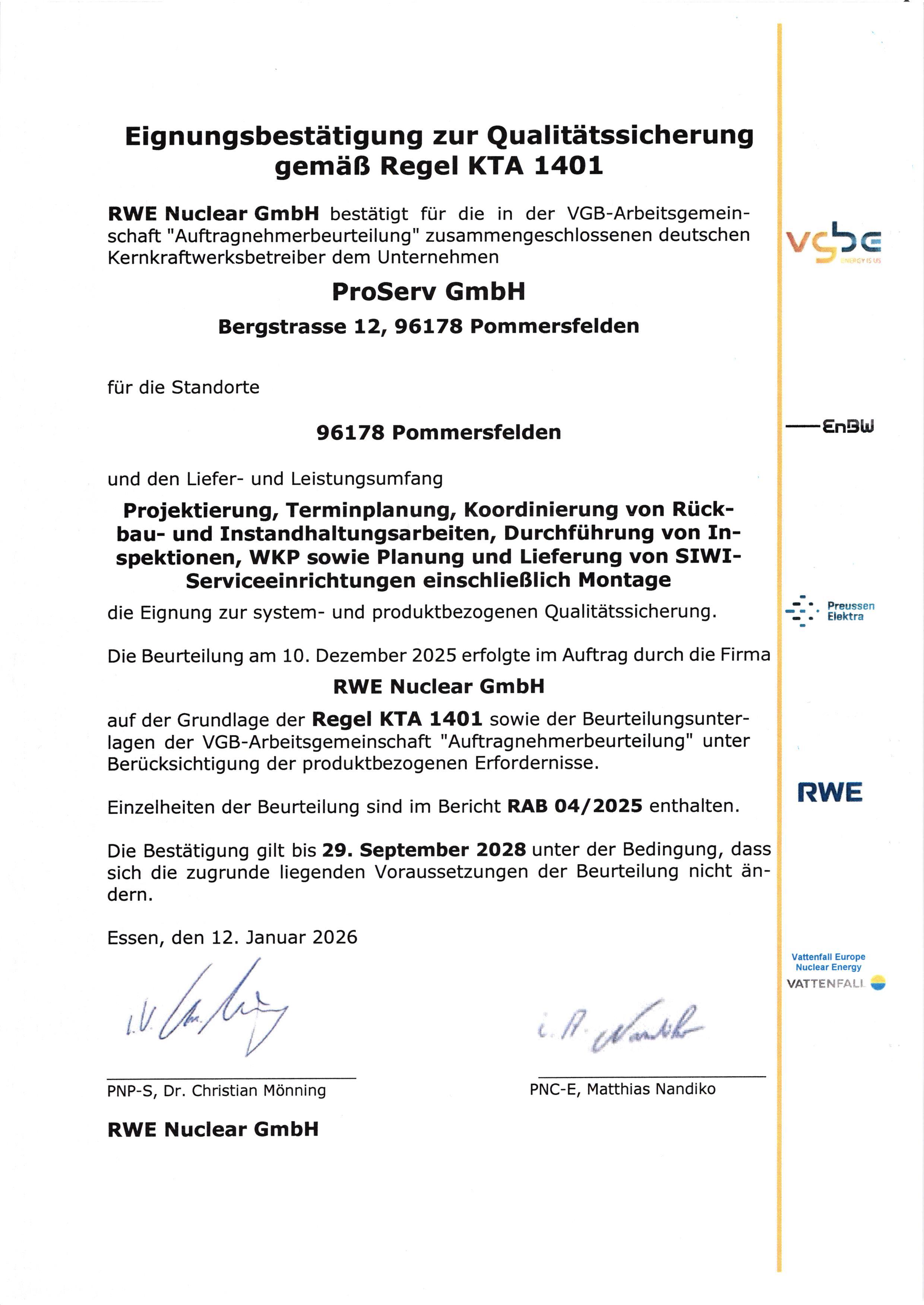 Die ProServ GmbH wurde im Mai 2001 gegründet durch die Gesellschafter Röckelein Harald und Zenkel Martin. Der Firmensitz ist in Pommersfelden im Landkreis Bamberg/Bayern. Das Leistungsspektrum der ProServ GmbH ist die Projektierung und Projektabwicklung, Service- und Inspektionstätigkeiten im Anlagenbau sowie die Entwicklung und Lieferung von Werkzeugen und Servicegeräten. Der Schwerpunkt ist die Projektierung und Projektabwicklung und liegt auf dem Gebiet der Terminplanung für die Nachrüstung, Neubau und Rückbau von kerntechnischen Anlagen, konventionellen Kraftwerken und Industrieanlagen im In- und Ausland. Auf Grund unserer Erfahrungen bietet die ProServ GmbH auch Serviceleistungen an. Darunter verstehen wir z. B. Inspektionen, die technische und personelle Unterstützung des Kunden, die Lieferung von Servicegeräten im Bereich Beckenflur von Kernkraftwerken und Industrieanlagen.