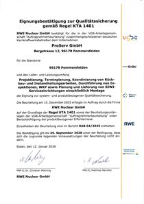- Qualitätsmanagementsystem - Zulassung nach KTA 1401, die den Anforderungen der DIN EN ISO 9001:2008 erfüllt
